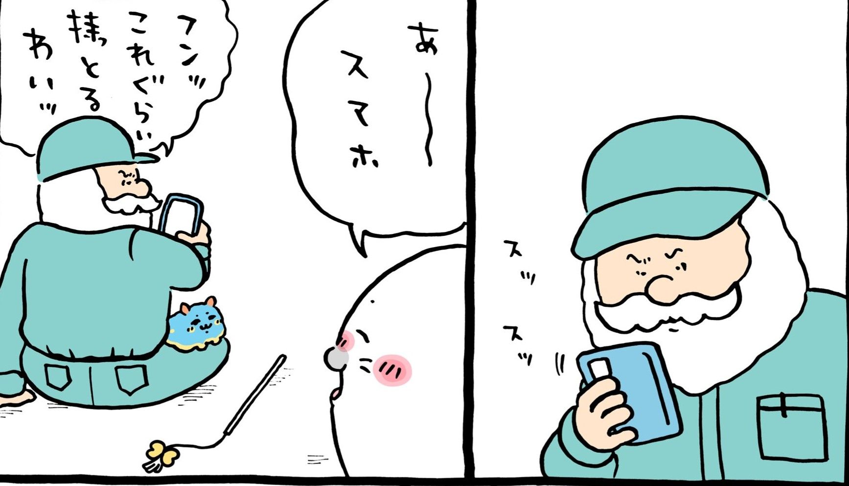 出だしの2コマの構図が前回のアザラシフォンとほぼ同じでウケる(3コマ目もそうだね)